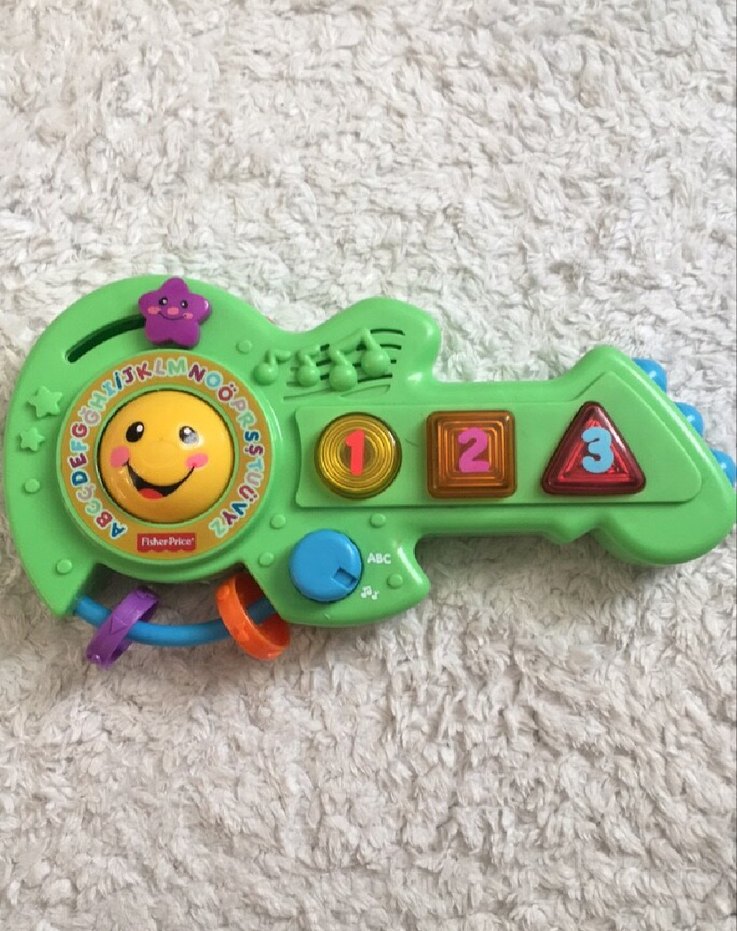 Renkli eğitici gitar oyuncağı, 1, 2 ve 3 sayılı düğmeler, gülen yüz ve müzik notaları içerir. Çocukların öğrenmesini destekler. Fisher price sorunsuz çalışıyor