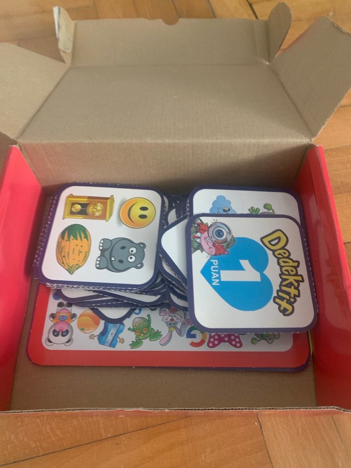 Çeşitli resimler ve puanlama sistemi içeren renkli eğitici kart oyunu.