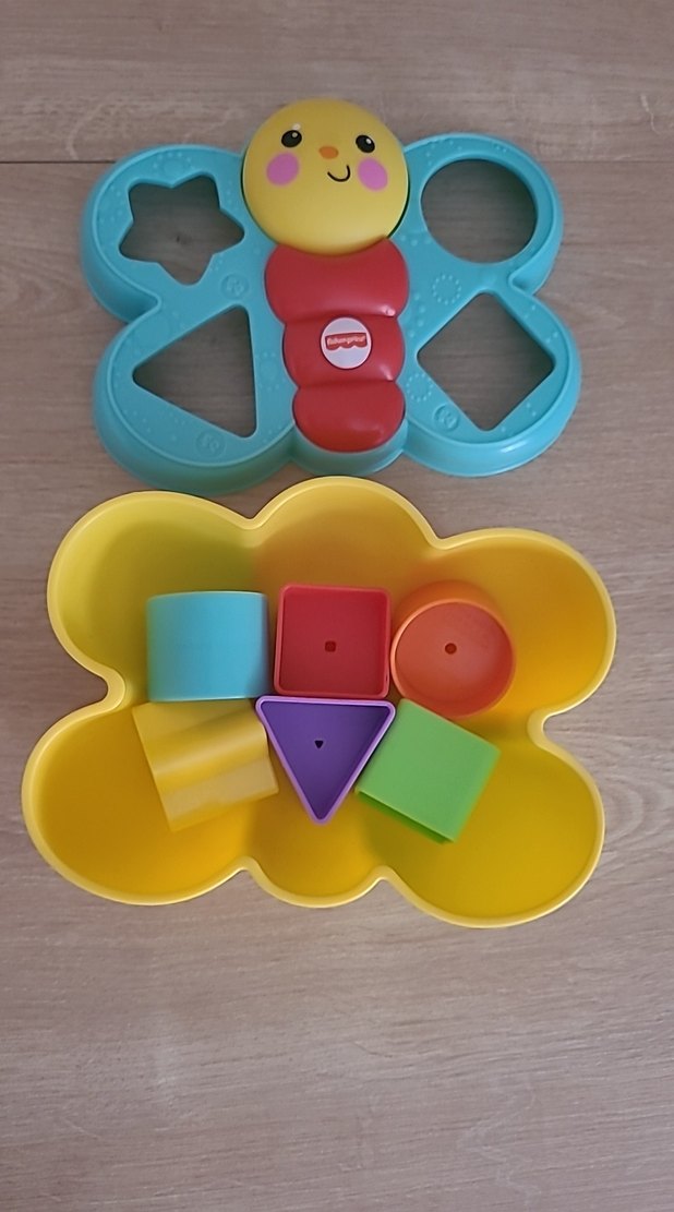Çeşitli şekilli bloklar içeren renkli kelebek şeklinde eğitici oyuncak, motor beceriler ve şekil tanımayı geliştirir.