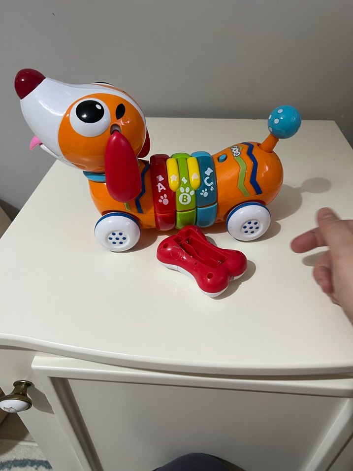 Harfler ve semboller içeren dönen halkalara sahip renkli eğitici köpek oyuncak, tekerlekli ve kırmızı kemik aksesuarıyla birlikte.