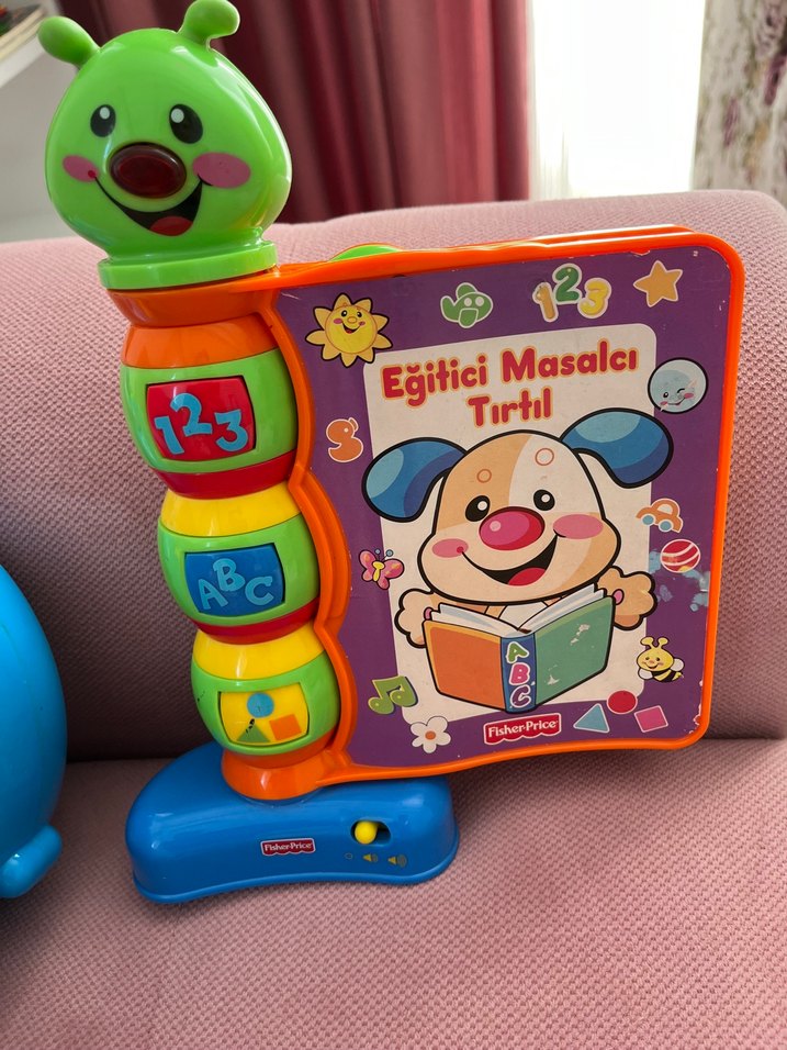 Renkli eğitici tırtıl oyuncak, 123 ve ABC düğmeleriyle sayıları ve harfleri öğretir, küçük kitapla hikaye anlatır. Ses ve ışık özelliklidir.