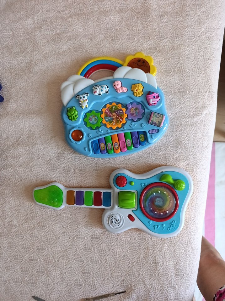 Hayvan figürlü piyano ve ışıklı sesli gitar içeren renkli eğitici oyuncaklar, çocukların duyularını ve yaratıcılığını destekler. sorunsuz çalışmaktadır sadece piyanoda 1-5-7 sayının yapışkanı kopmuş