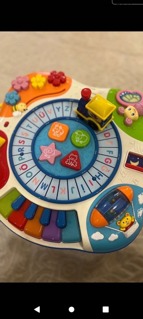 Renkli eğitici oyuncak, dönen harf tekerleği, hayvan düğmeleri, küçük piyano tuşları ve oyuncak tren ile ayı figürü içerir.