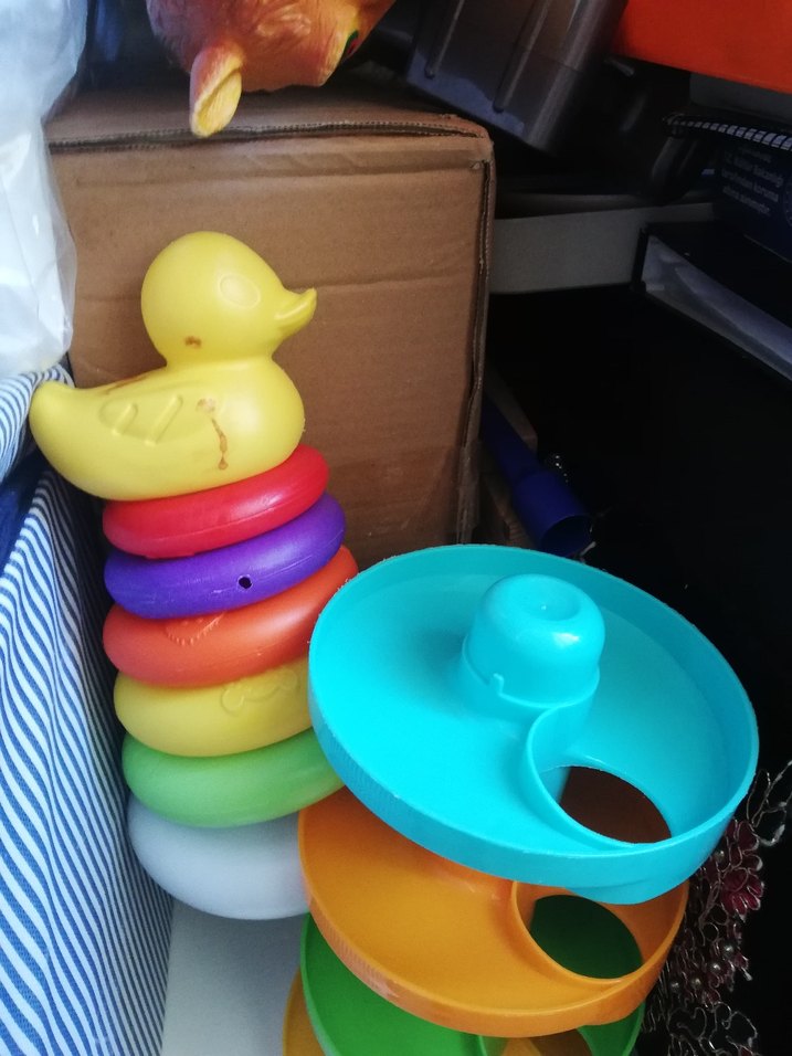 Renkli halkalardan oluşan ve üstünde sarı ördek bulunan eğitici oyuncak, motor becerileri ve el-göz koordinasyonunu geliştirmeye yardımcı olur.