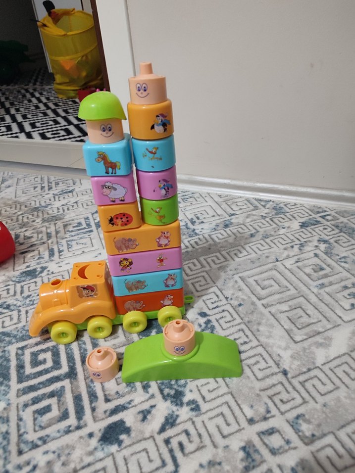 Hayvan resimli renkli eğitici oyuncak bloklar, tren tabanıyla üst üste dizilip inşa edilebilir.
