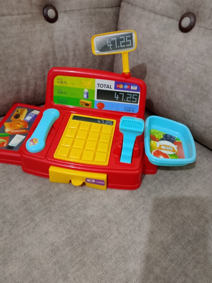 Renkli eğitici oyuncak kasa, tarayıcı, tuş takımı ve 47.25 toplam gösterimli ekran içerir. Sepeti ve çeşitli etkileşimli özellikleri bulunur.