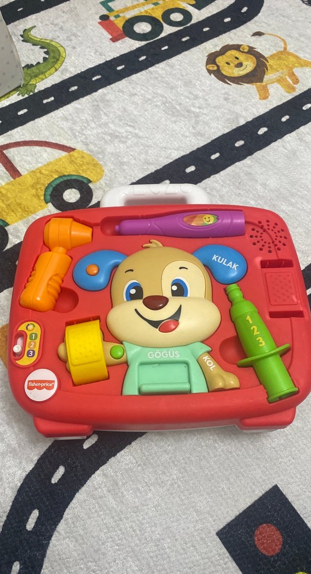 Renkli eğitici oyuncakta, 'kulak', 'göğüs' ve 'kol' gibi etiketli köpek figürü ve sayılarla işaretlenmiş oyuncak aletler bulunur.