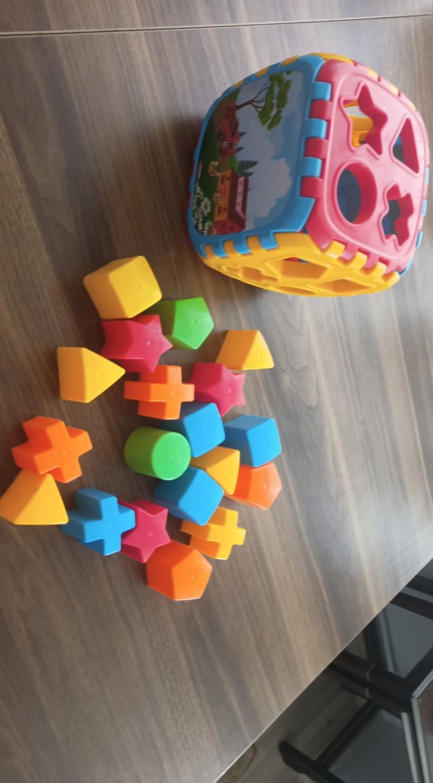 Çocukların öğrenmesini destekleyen, çeşitli şekiller ve renkli görseller içeren renkli eğitici oyuncak küp.