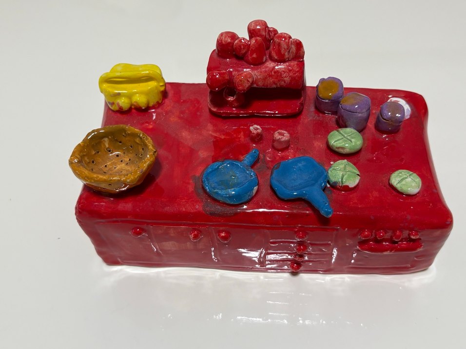 Renkli ve eğitici oyuncak mutfak setinde kırmızı taban üzerinde küçük tava, tabak ve yiyecekler bulunur. el yapımı seramik