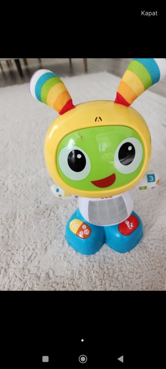 Büyük gözlere ve gökkuşağı çizgili antenlere sahip, renkli eğitici oyuncak robot. Öğrenme için düğmeler içerir ve mavi ayaklar üzerinde durur.