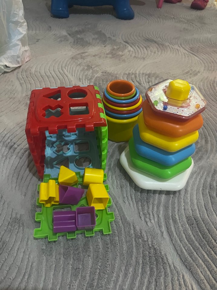 Erken öğrenim ve gelişim için şekil eşleştirme küpü, halka dizme ve altıgen dizme parçalarından oluşan renkli eğitici oyuncak seti. İç içe geçmeli olanda eksik var