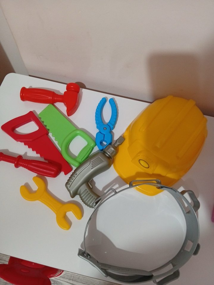 Sarı kask, kemer, testere, çekiç, pense, anahtar, matkap gibi oyuncak aletlerden oluşan renkli eğitici tamir seti. ️hiç kullanılmadı
