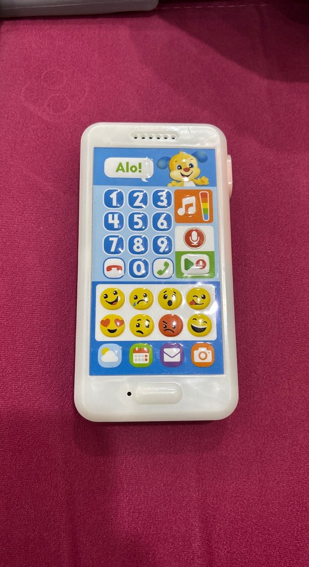 Renkli düğmeli sayılar, emojiler ve ikonlar içeren beyaz kasalı eğitici oyuncak telefon.
