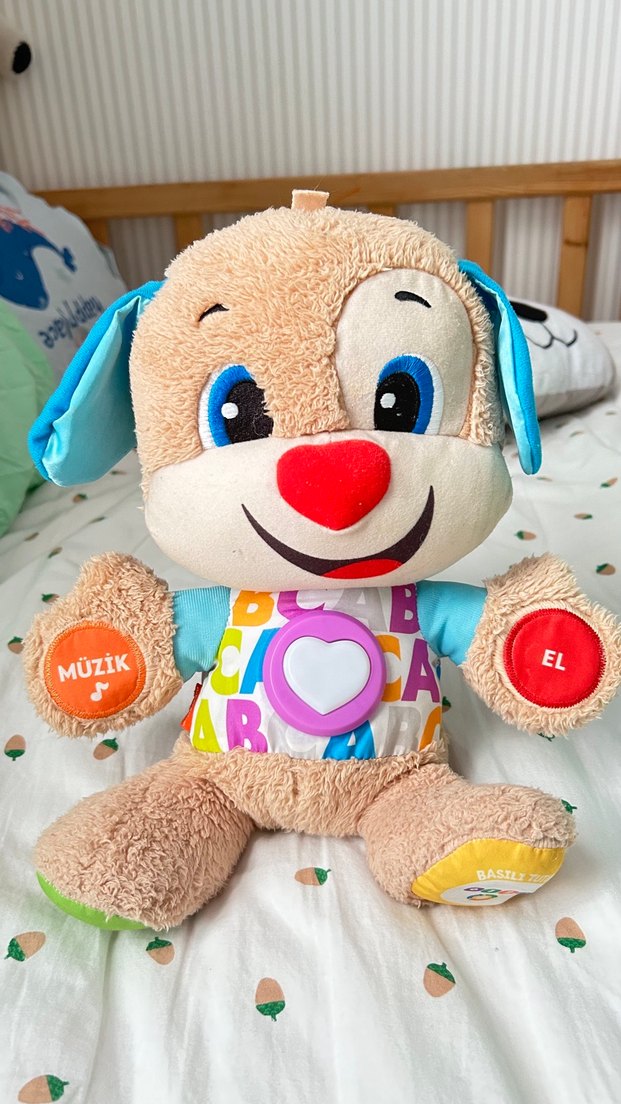 Renkli peluş köpek oyuncakta 'Müzik' ve 'El' yazılı düğmeler ile kalp şeklinde bir buton bulunur. Çocukları müzik ve öğrenme ile eğlendirir.