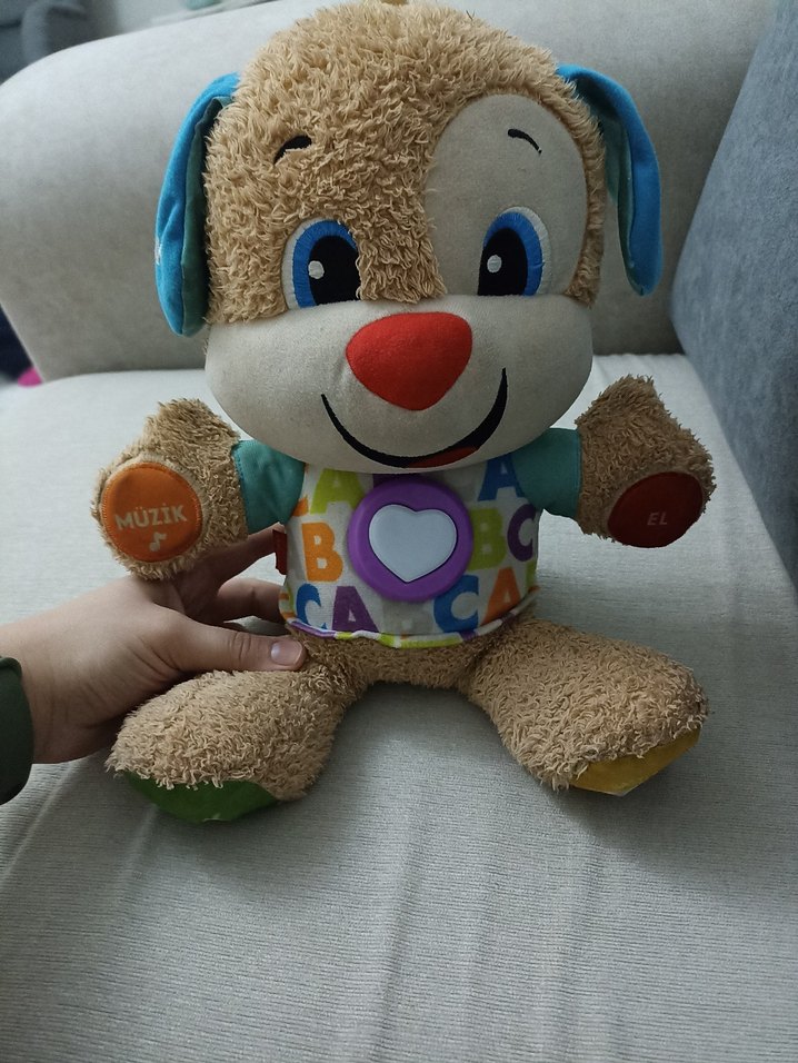 Renkli kahverengi peluş köpek oyuncak, yumuşak dokulu ve alfabe temalı detaylara sahip. eğitici köpekcik sadece kulağındaki düğme çalışmıyor çok az kullanıldı kalan aksamlarında hiçbir problem yok kızım sıkıldığını için satıyorum