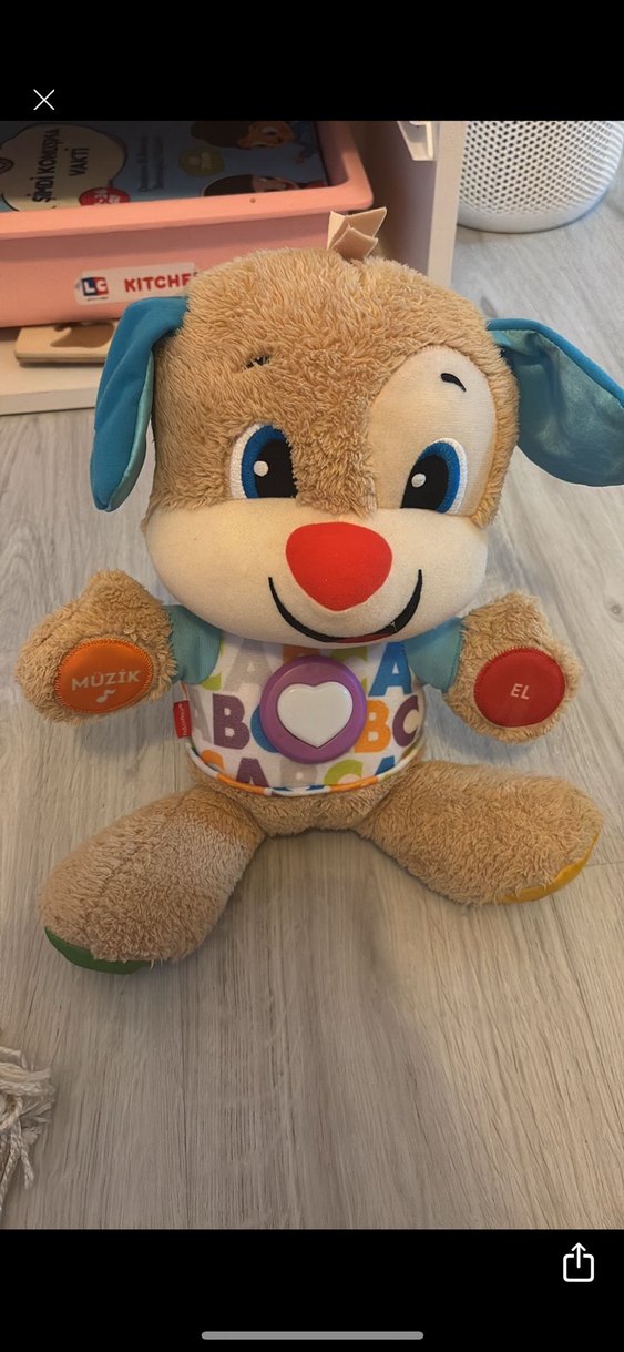 Renkli peluş köpek oyuncak, 'MUZIK' ve 'EL' yazılı butonlarla müzik ve el aktiviteleri sunar. Çocukların öğrenmesini destekler.