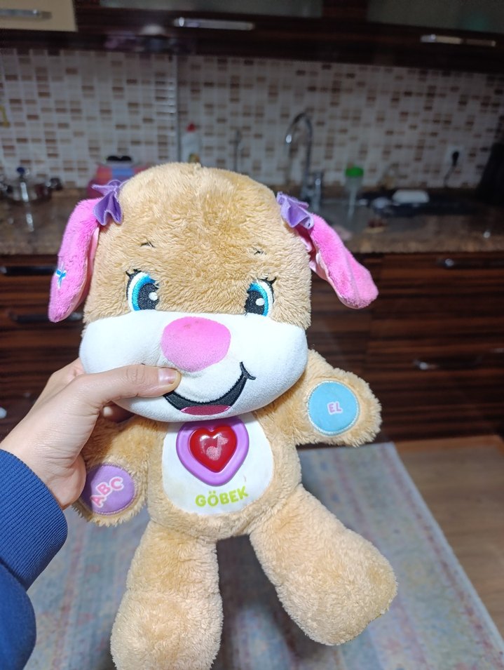 Renkli, peluş ve camel renkli eğitim köpeği, üzerinde harfler ve kalp simgesi bulunan etkileşimli düğmeler içerir.