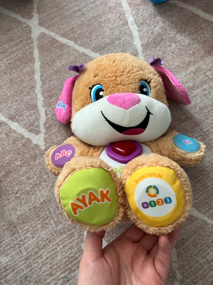 Fisher price markalı Renkli ve peluş olan bu eğitici oyuncak köpekte 'AYAK' ve 'EL' yazılı butonlar bulunur, dokunarak öğrenmeyi teşvik eder. Kulak düğmesi çalışmıyor ama el ayak düğmeleri çalışıyor çocuğum organlarını eğlenceli bir şekilde öğretiyor