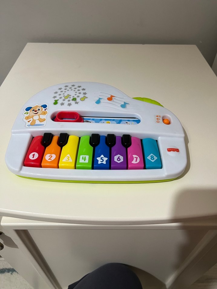 1'den 8'e kadar numaralandırılmış tuşlara sahip renkli eğitici piyano oyuncağı. Çocukların müzik ve öğrenmeyle ilgilenmesini sağlar.