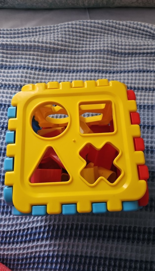 Çeşitli şekil boşlukları olan sarı tabanlı renkli eğitici oyuncak, çocukların şekil ve renkleri öğrenmesine yardımcı olur.