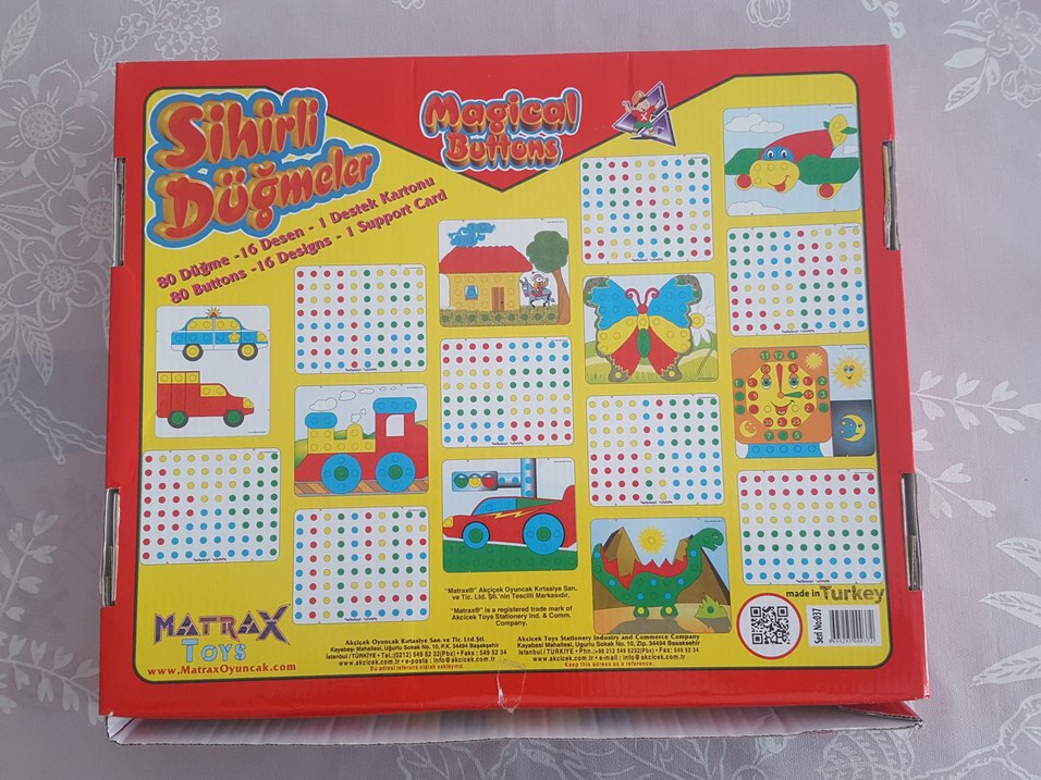 3 yaş ve üzeri çocuklar, “Sihirli Düğmeler” sayesinde, ilk mozaik desenlerini 80 büyük kırılmaz düğmeyi şeffaf sahaya takarak oluşturabilir. 16 gerçekçi ve grafik konulu farklı ve eğitici desenler içeren 8 Desen Kartonunu Destek kartonunun da yardımı ile kolayca Şeffaf Sahanın altına takabilirler. Bu oyuncak; el göz koordinasyonu ve psikomotor gelişiminine, çocukların kendi dizaynlarını yapmaya başlamalarıyla da yaratıcılıklarının gelişimine yardımcı olur. Renkli parçaları birleştirerek çeşitli şekiller ve yapılar oluşturmayı mümkün kılan bu set, çocukların uzun süre keyifle oynamasını sağlar. Her bir parça, çocukların küçük elleri için uygun boyutta ve güvenli malzemelerden üretilmiştir. Çocuklara renkleri ve geometrik şekilleri öğretirken aynı zamanda problem çözme yeteneklerini ve ince motor becerilerini geliştirmelerine yardımcı olur. Çocukların yaratıcılıklarını geliştirmeleri için idealdir. Yüksek kaliteli, toksik olmayan malzemelerden üretilmiştir.