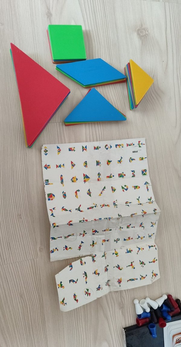 Çeşitli geometrik şekiller ve farklı figürler oluşturmak için örnekler içeren renkli eğitici tangram seti.