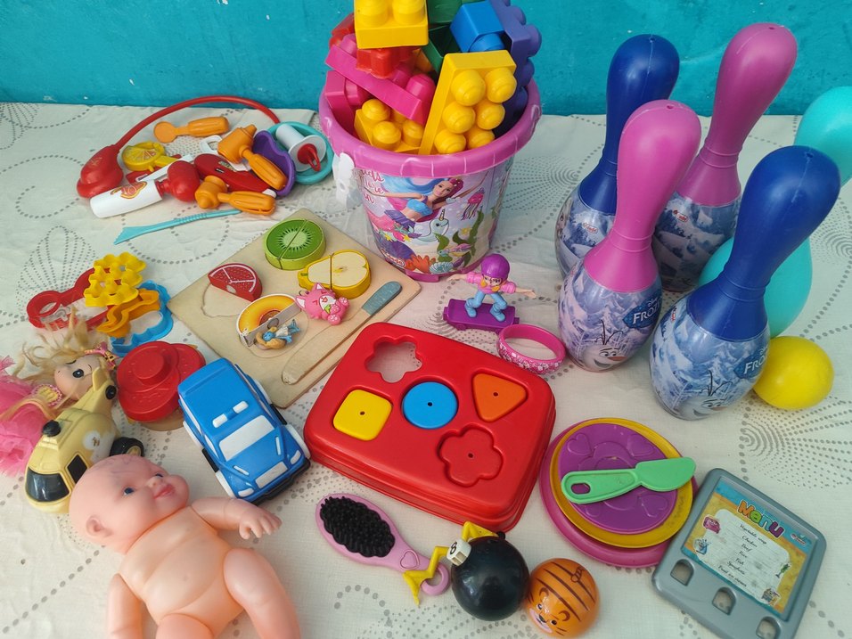 Bloklar, şekil kutusu, oyuncak araba ve oyun yiyecekleri içeren renkli eğitici ve eğlenceli oyuncak seti.