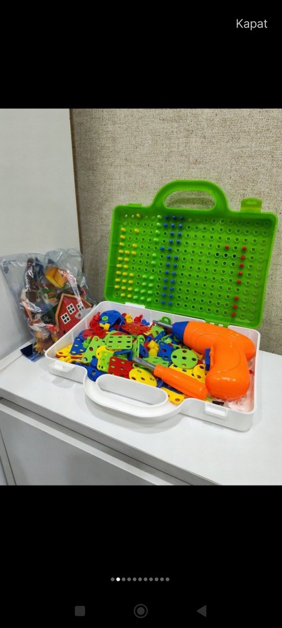 Bu renkli eğitici oyuncak seti, çeşitli plastik parçalar ve oyuncak matkap içerir. Taşınabilir kutu içinde, yaratıcılığı ve ince motor becerilerini destekler.