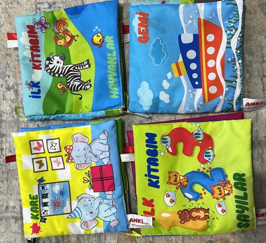 Hayvanlar, gemi ve sayılar içeren renkli yumuşak kumaş kitaplar. Canlı çizimler ve basit metinler bulunur.
