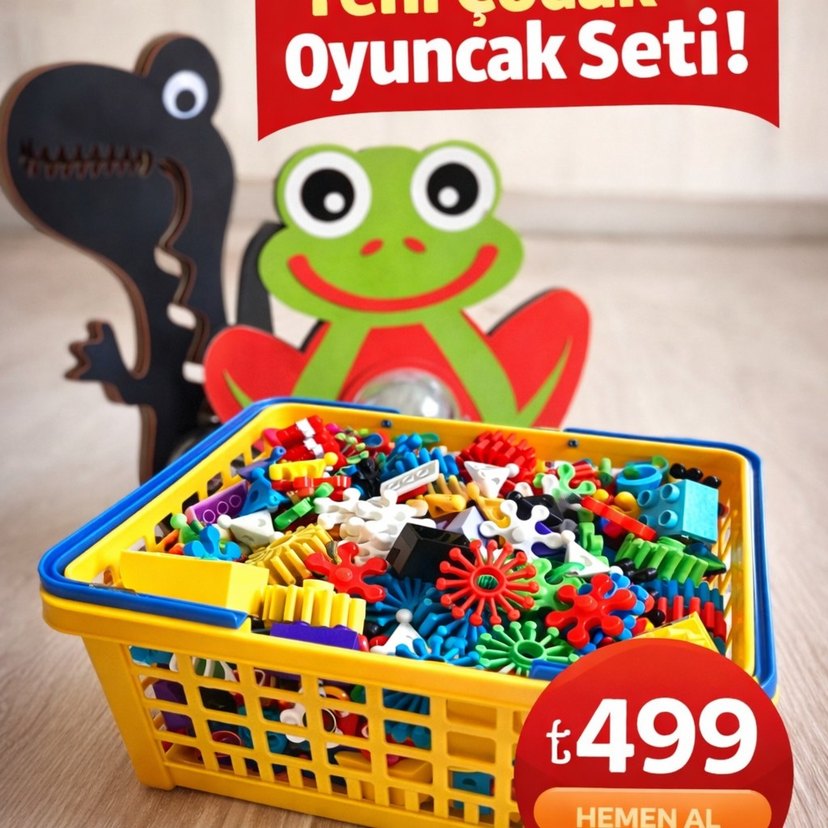 Yaratıcılığı ve motor becerileri geliştiren çeşitli renkli ve şekilli parçalar içeren eğitici oyuncak seti.