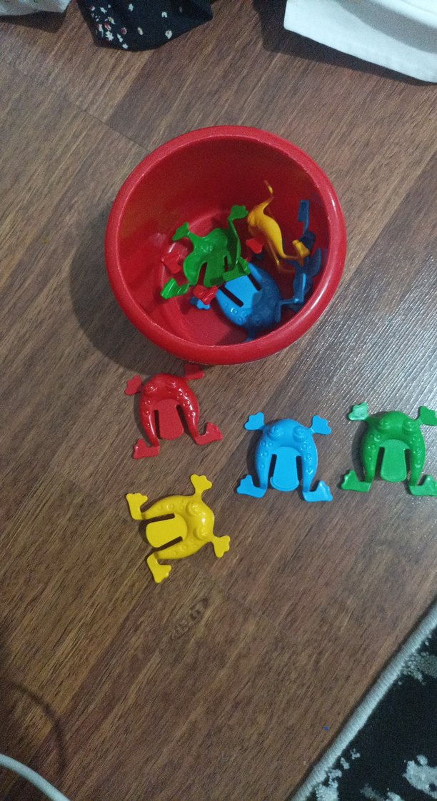 Çeşitli renklerde plastik kurbağa oyuncakları ve kırmızı saklama kabı. Çocukların oyun ve öğrenme sürecini destekler.