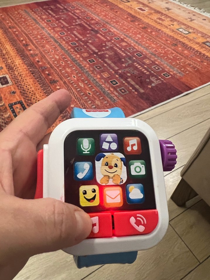 Çocuklar için müzik, telefon, kamera gibi simgeli etkileşimli düğmeler içeren renkli eğitim akıllı saat oyuncak.