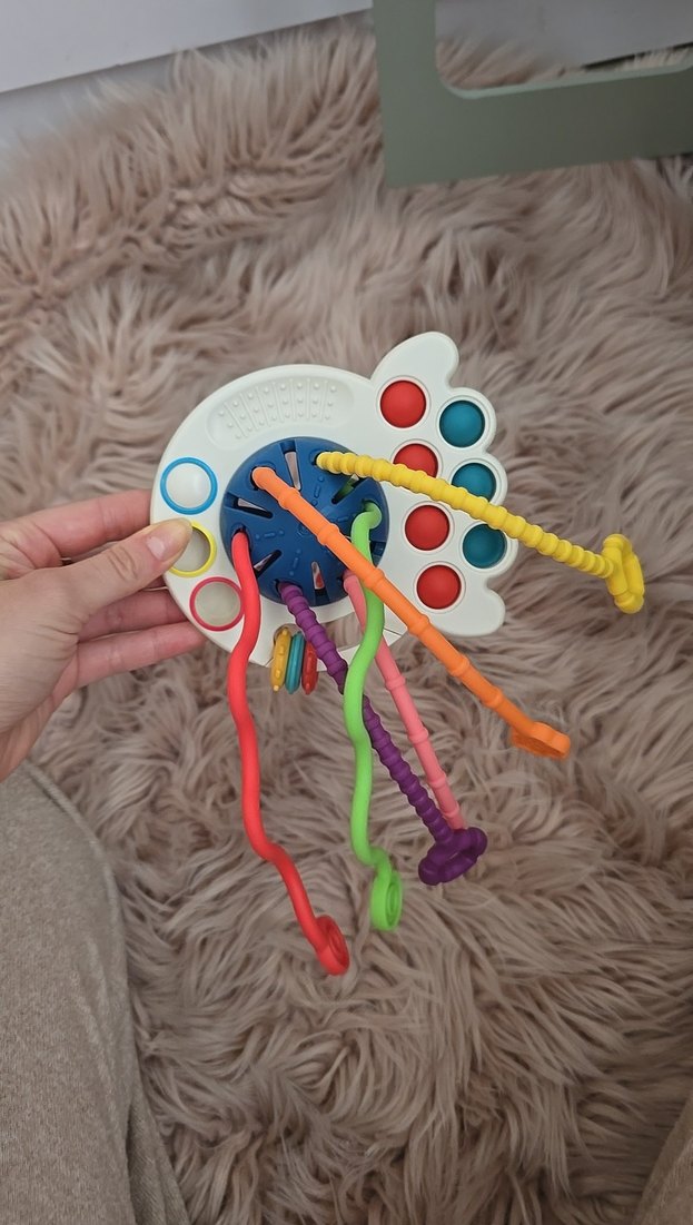 Bu renkli eğitim oyuncağı, duyusal oyun ve ince motor beceriler için çeşitli dokulu ipler ve düğmeler içerir.