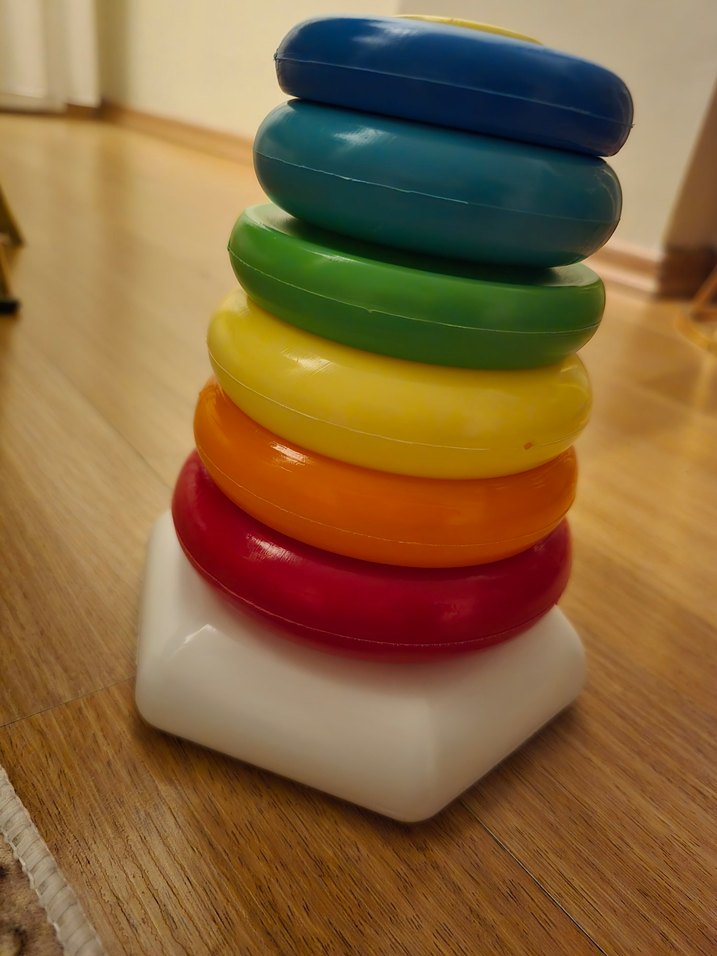Bu renkli eğitim oyuncağı, farklı canlı renklere sahip üst üste dizilebilir halkalar içerir, çocukların motor becerilerini geliştirmek için uygundur.