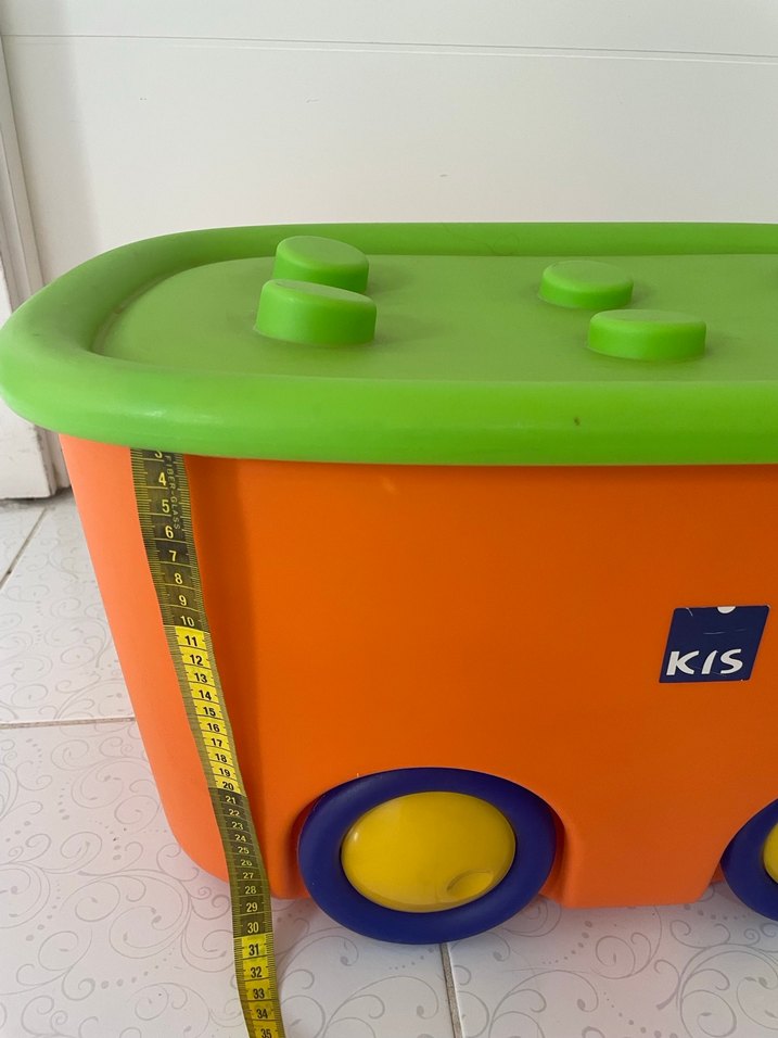 Bu renkli eğitim oyuncağı kutusu, yeşil kapaklı, turuncu gövdeli ve mavi-sarı tekerlekli olup oyuncakları düzenlemek için uygundur.
