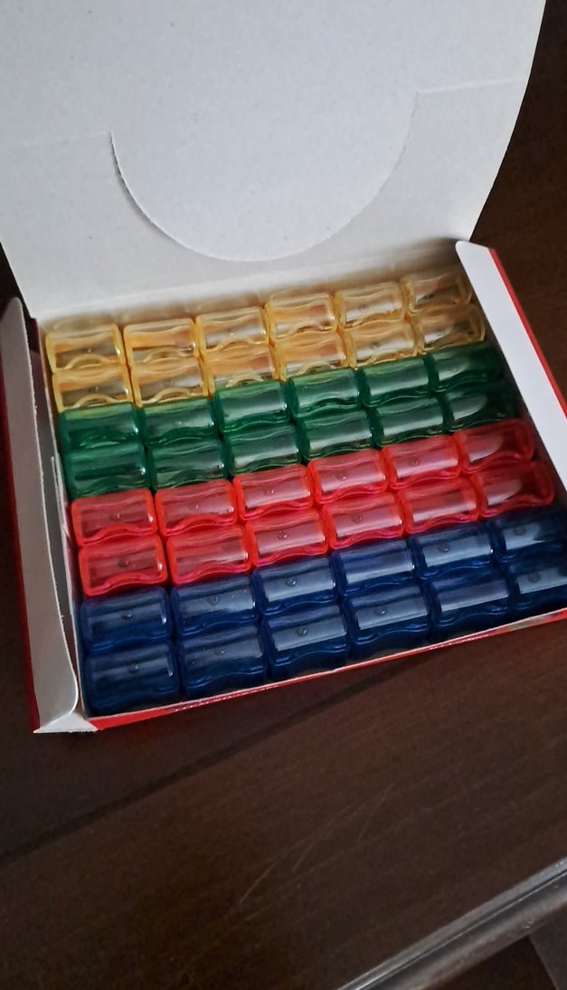Sarı, yeşil, kırmızı ve mavi renklerde çok sayıda parçadan oluşan renkli kalemtıraş