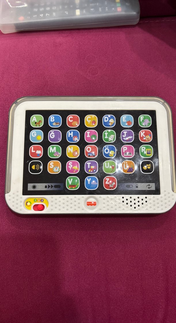 Renkli alfabe düğmeleri ve etkileşimli ses fonksiyonları içeren eğitim amaçlı oyuncak tablet.