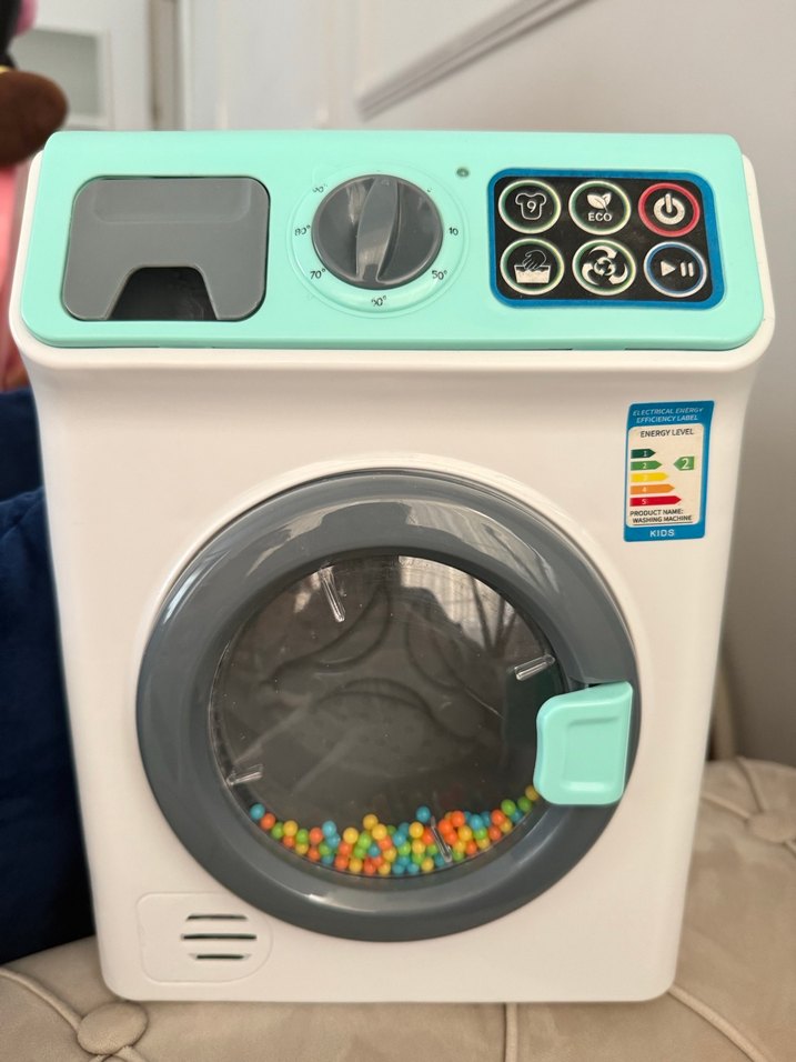 Renkli boncuklarla dolu şeffaf kapılı, döner düğmeli ve çeşitli butonları olan eğitim amaçlı oyuncak çamaşır makinesi. Çalışır durumda hiç bir sıkıntısı yoktur.
