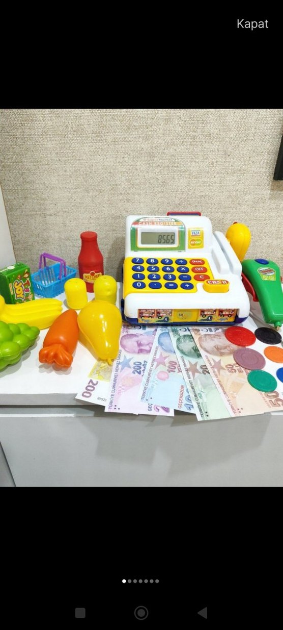Oyuncak kasa, oyun paraları, plastik meyve ve sebzeler içeren renkli eğitim oyuncakları seti. Hayal gücünü ve öğrenmeyi destekler.