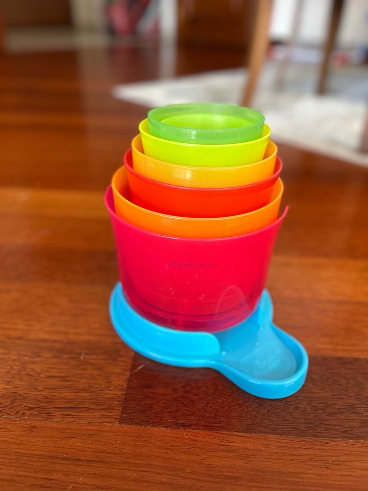 Topu vardır. 0-3 yaş için çok ideal uzun süre oyalar. Farklı boyutlarda, renkli üst üste koyma bardakları seti. Eğitici oyuncak olarak öğrenmeyi destekler.