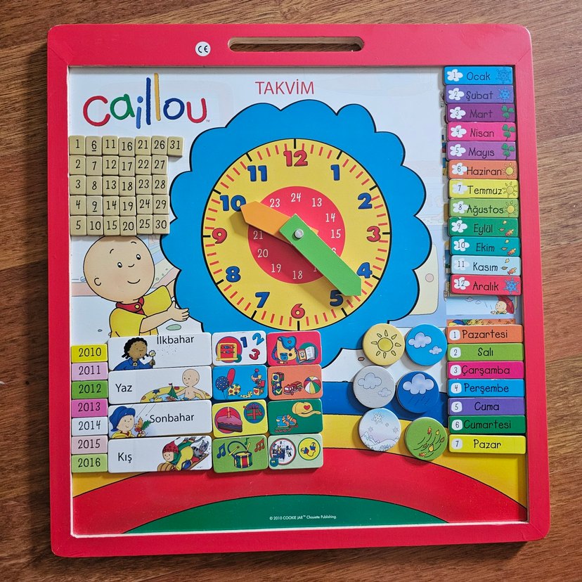 Renkli eğitim oyuncağında hareketli saat ibreleri, Türkçe aylar, günler ve mevsimler yer alır.