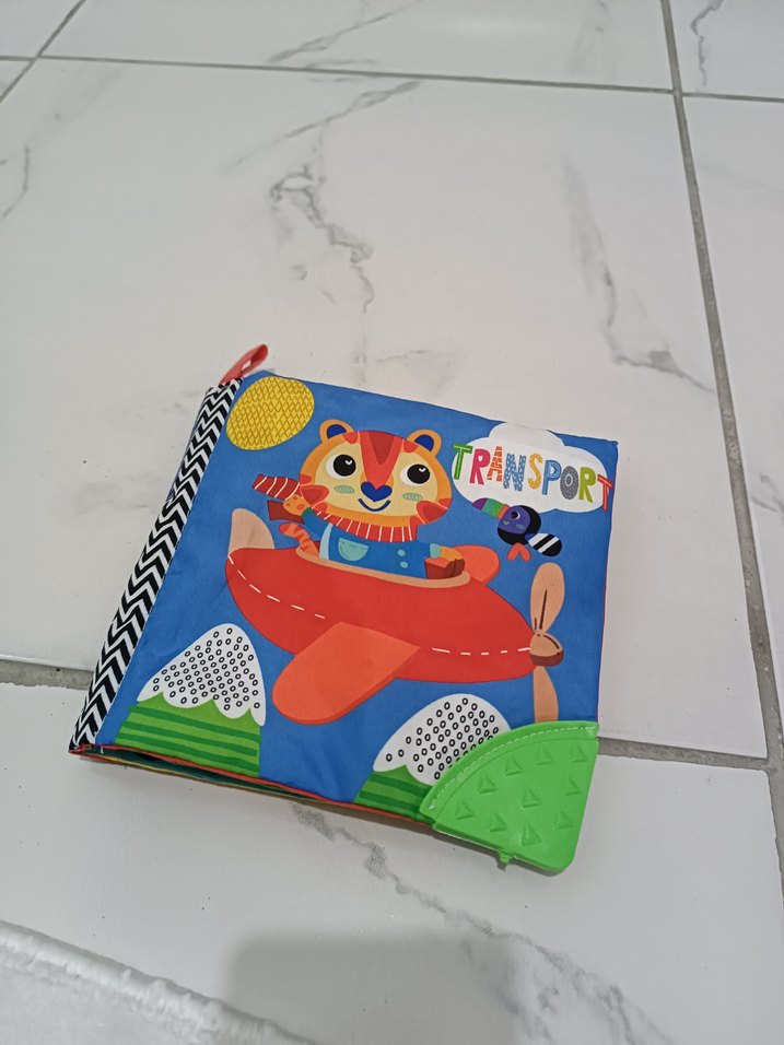 Renkli yumuşak kumaştan yapılmış, taşıma temalı eğitici ve duyusal gelişimi destekleyen bir kitap.