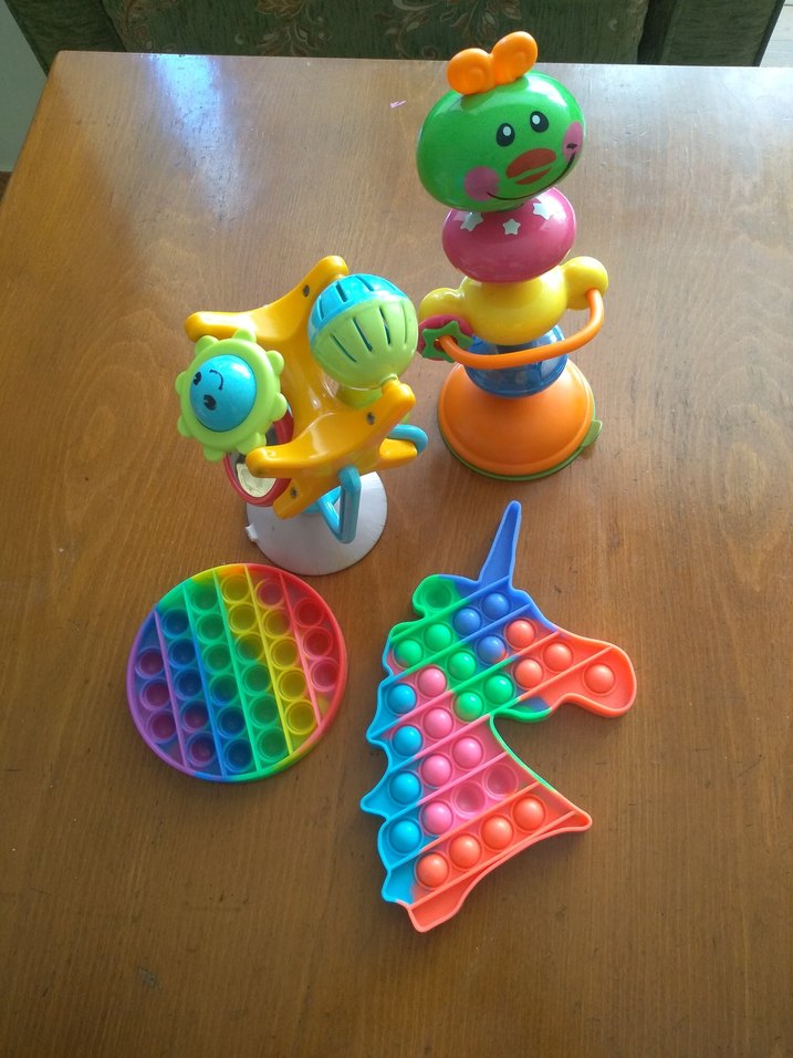 Renkli oyuncak seti, vantuzlu oyuncak, tırtıl üst üste koyma ve yuvarlak ile tek boynuzlu gökkuşağı pop-it oyuncakları içerir.