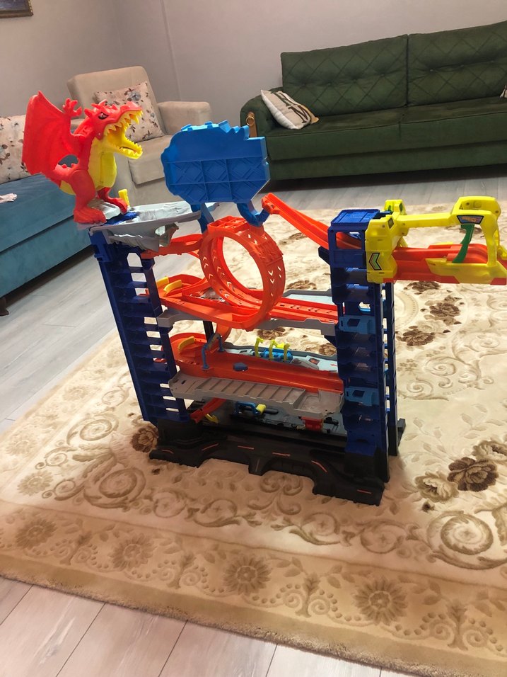 Renkli ejderha figürlü, döngü ve rampalara sahip oyuncak yarış parkuru. Canlı renkleriyle çocukların hayal gücünü destekler.