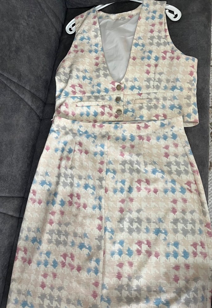 urun 3Xl kalibi biraz dar. etek boy 98cm etek bel 41 cm yelek bel genisligi 47 cm marka temsili Düğmeli, yakalı yelek ve uzun etekten oluşan pastel çok renkli bohem tarzda kadın takımı. Ofis için uygun, regular fit kesim ve kolsuz tasarım sunar.