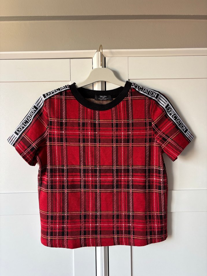 renkli kırmızı ekose desenli, kısa kollu ve bol kesim tişört. Yuvarlak yaka ve omuzlarda detaylar bulunur. Yumuşak tekstil kumaştan üretilmiştir. Kumaşı birazcık kalın.