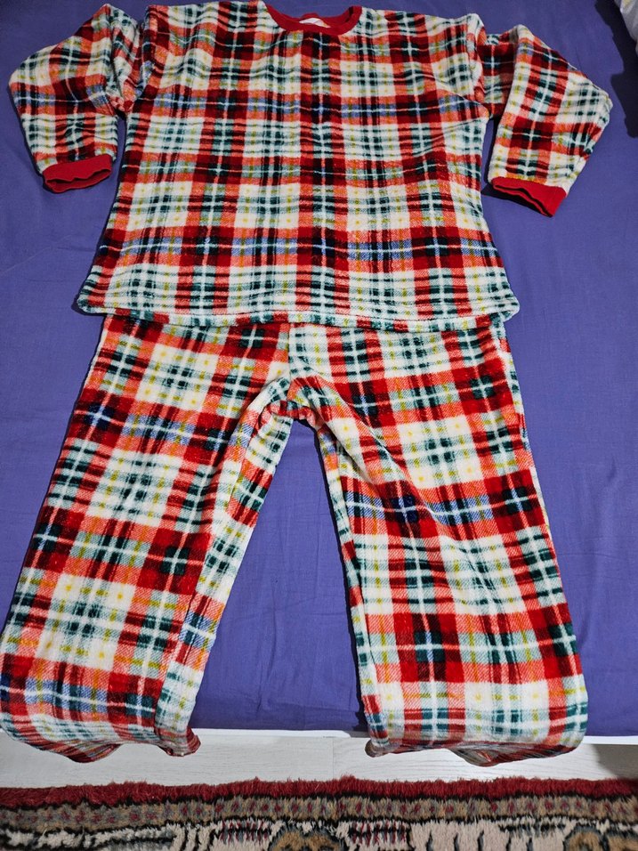 Renkli ekose desenli, uzun kollu ve yuvarlak yaka pijama takımı. Örgü kumaştan, rahat ve sıcak tutar. Midi uzunlukta üst ve pantolon içerir.