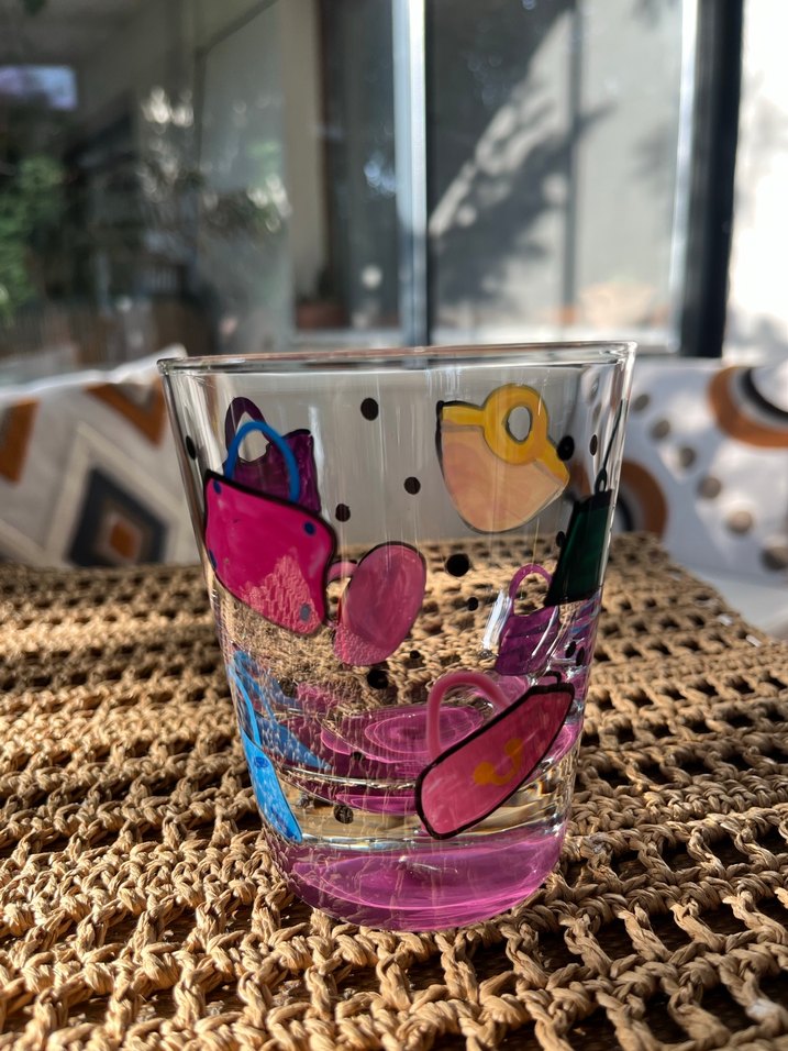 Renkli çanta desenleri ve siyah noktalarla süslenmiş şeffaf cam bardak, içeceklerinize eğlenceli bir hava katıyor.