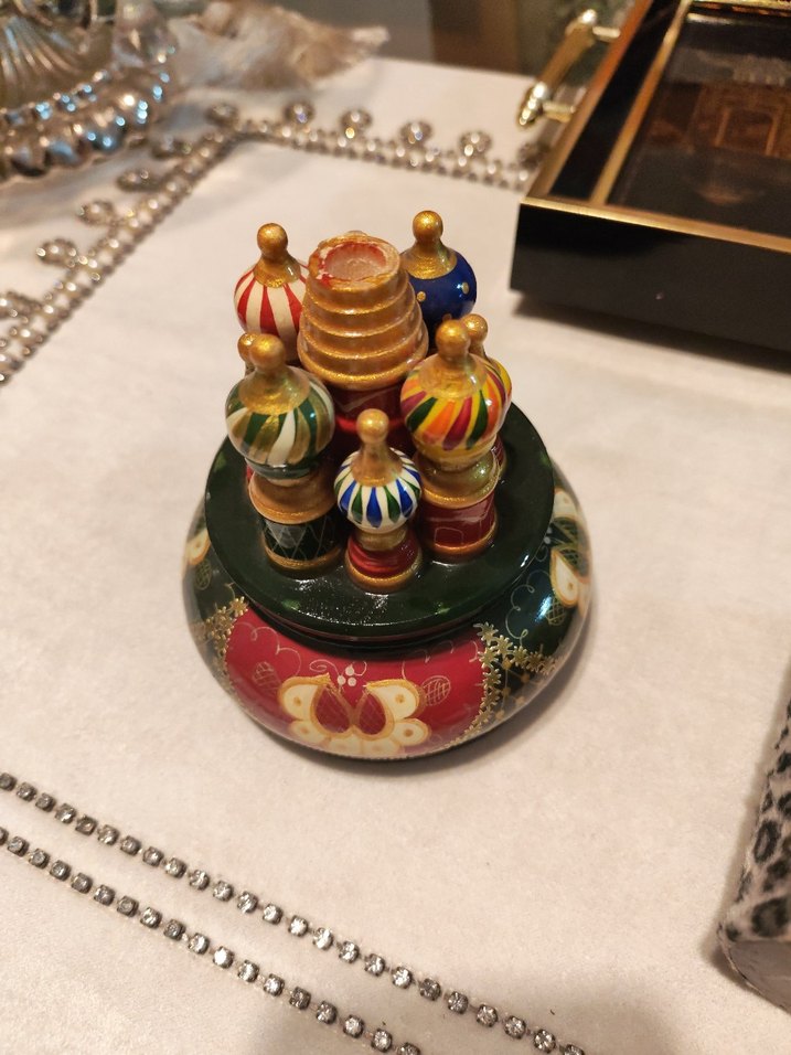 Çok renkli, el boyaması figürin. Üzerinde çeşitli renklerde kubbeler bulunan detaylı ve dekoratif bir parça.