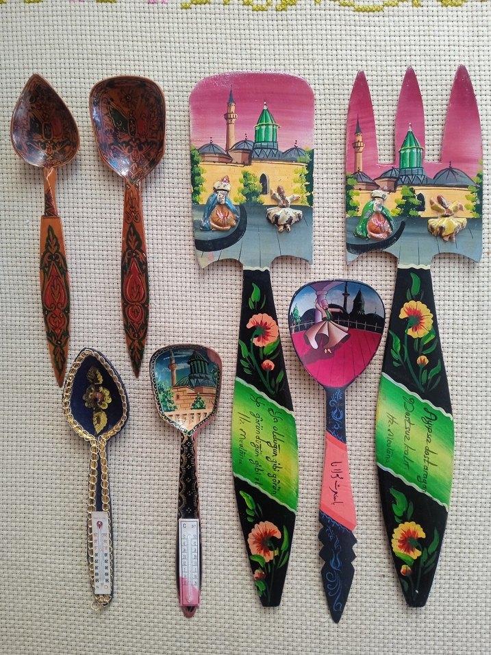 Kültürel motiflerle süslenmiş, el boyaması renkli kaşık ve çatallardan oluşan koyu renkli set. Her parça benzersiz desenlere sahip. buyukler 40cm 2 adet küçükler 22cm 4 adet orta boy 27 cm 1 adet